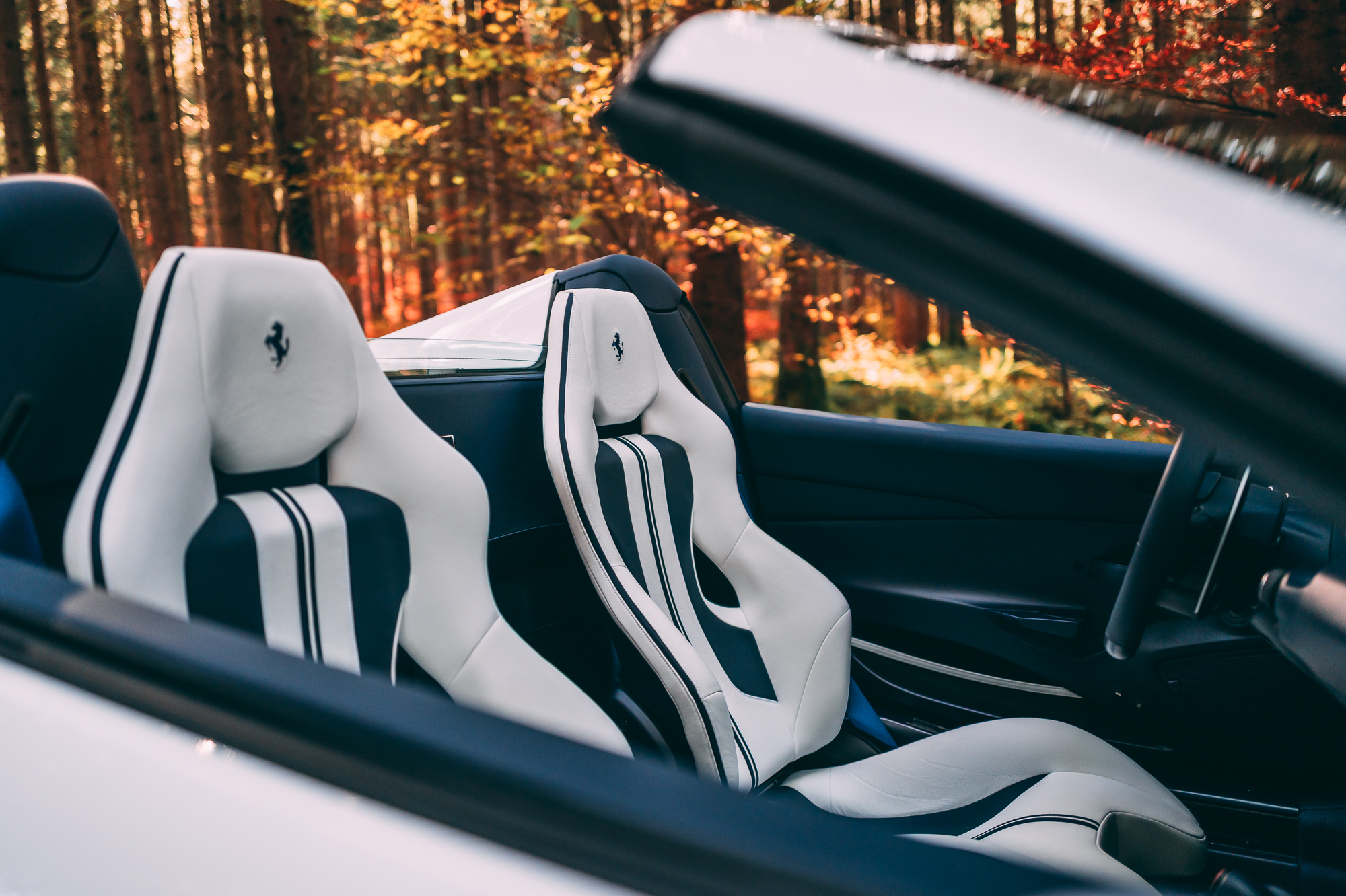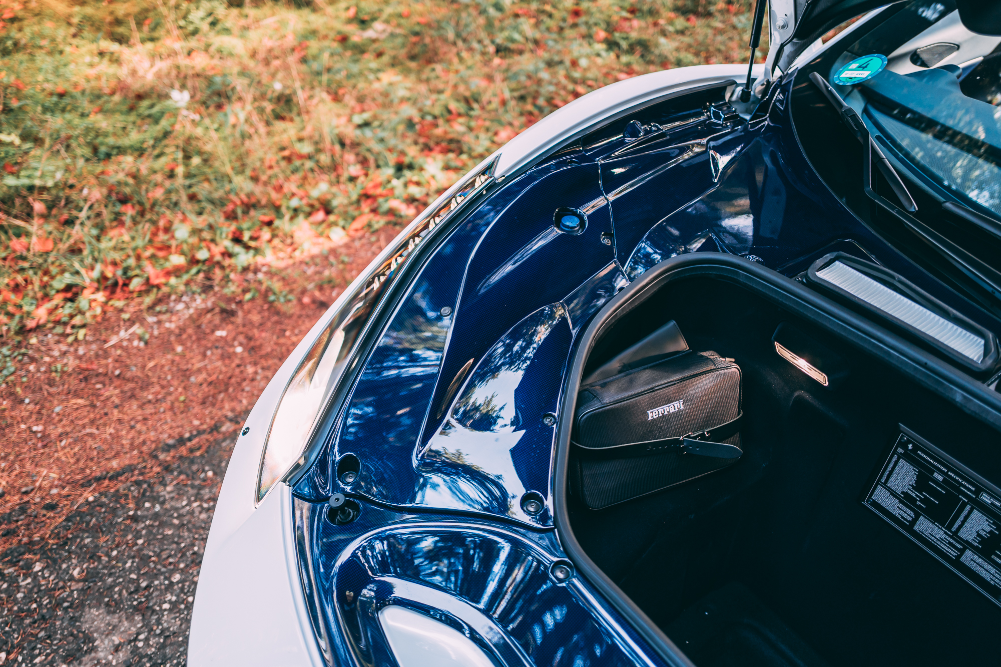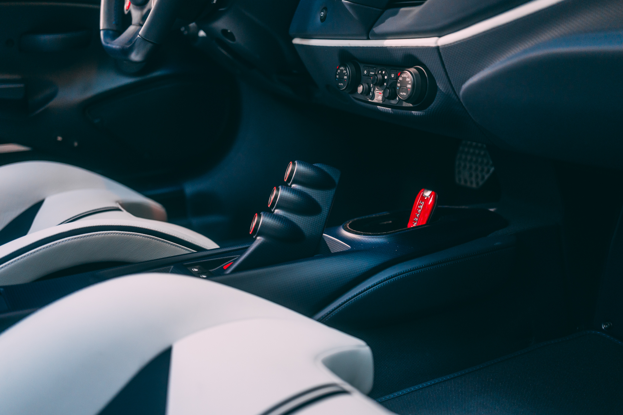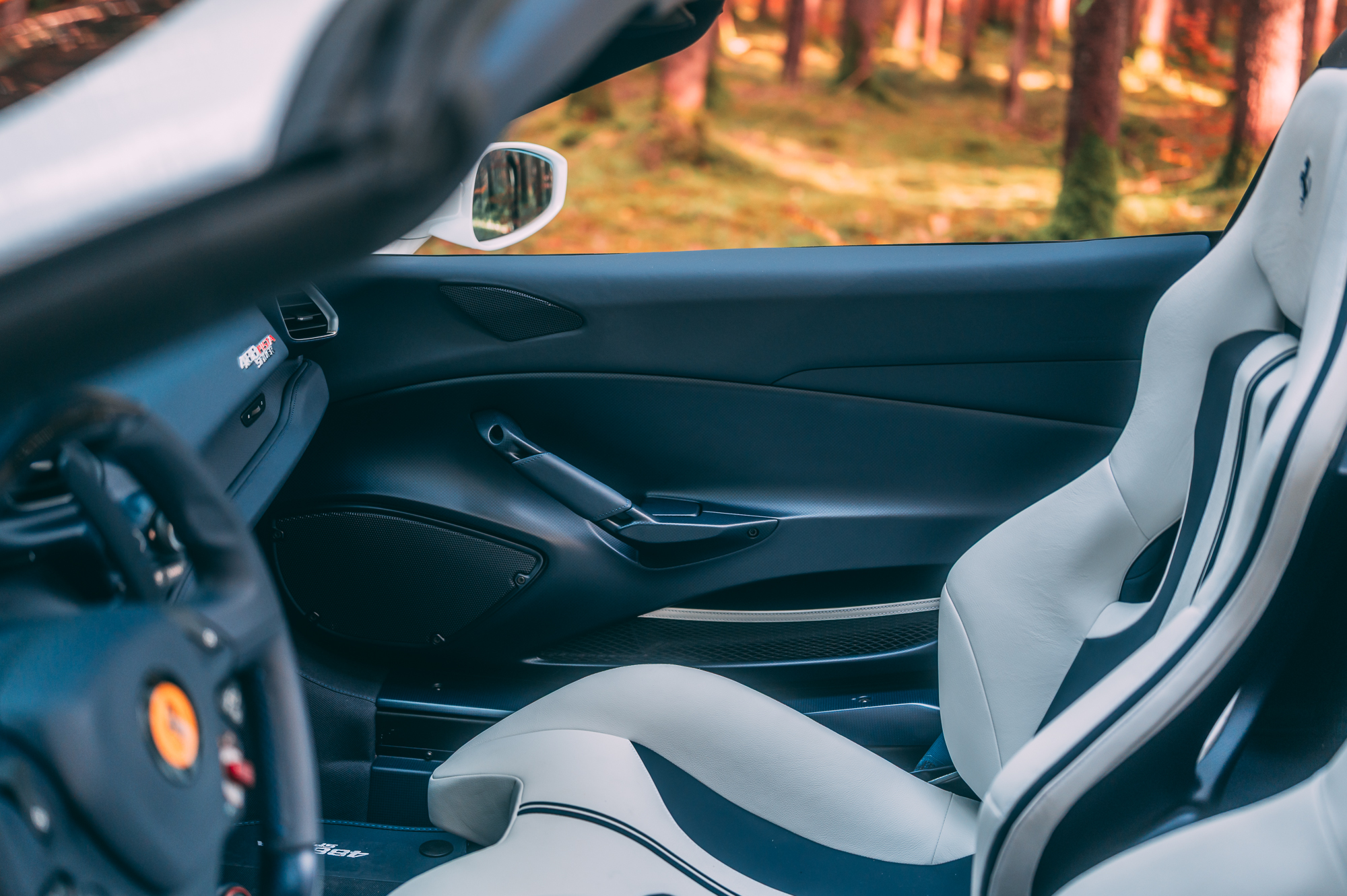 All possible carbon fibre options were ticked, in a stunning shade of Blu Lucido for the exterior with a gloss finish, complementing the Blue center stripe and the white paint. The level of detail is highly impressive with every element carefully contrasted in colour and finish forming a coherent design.