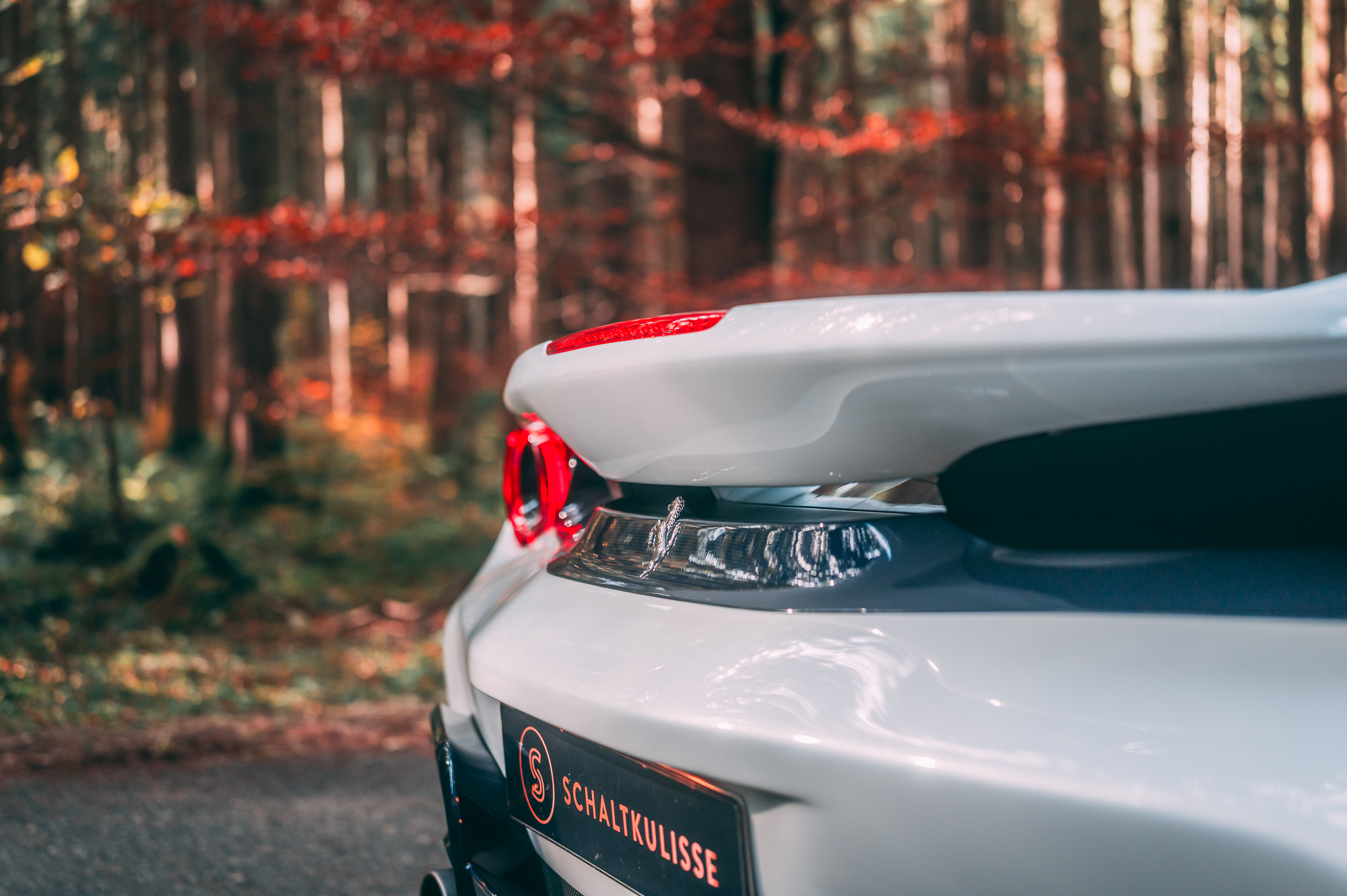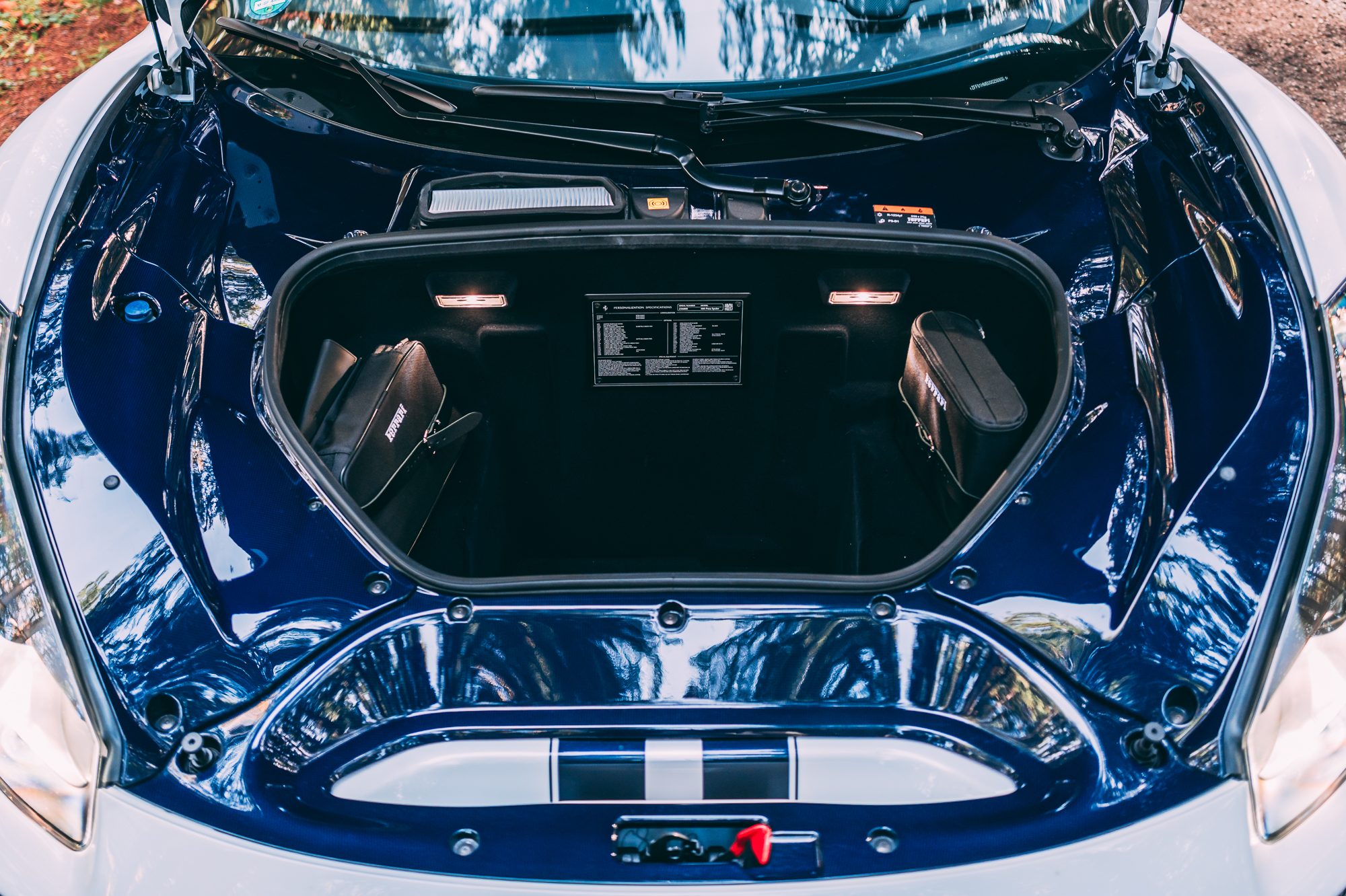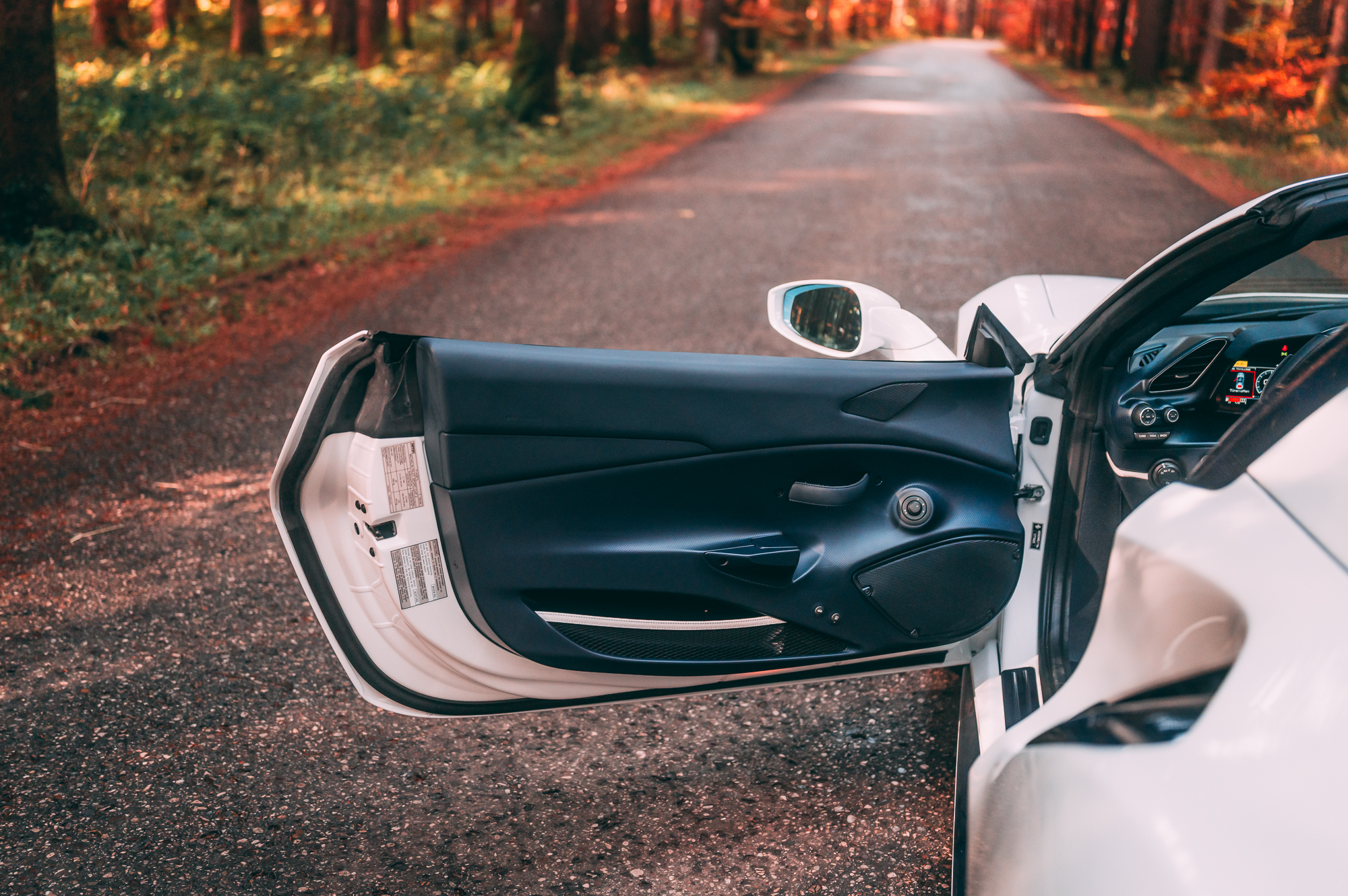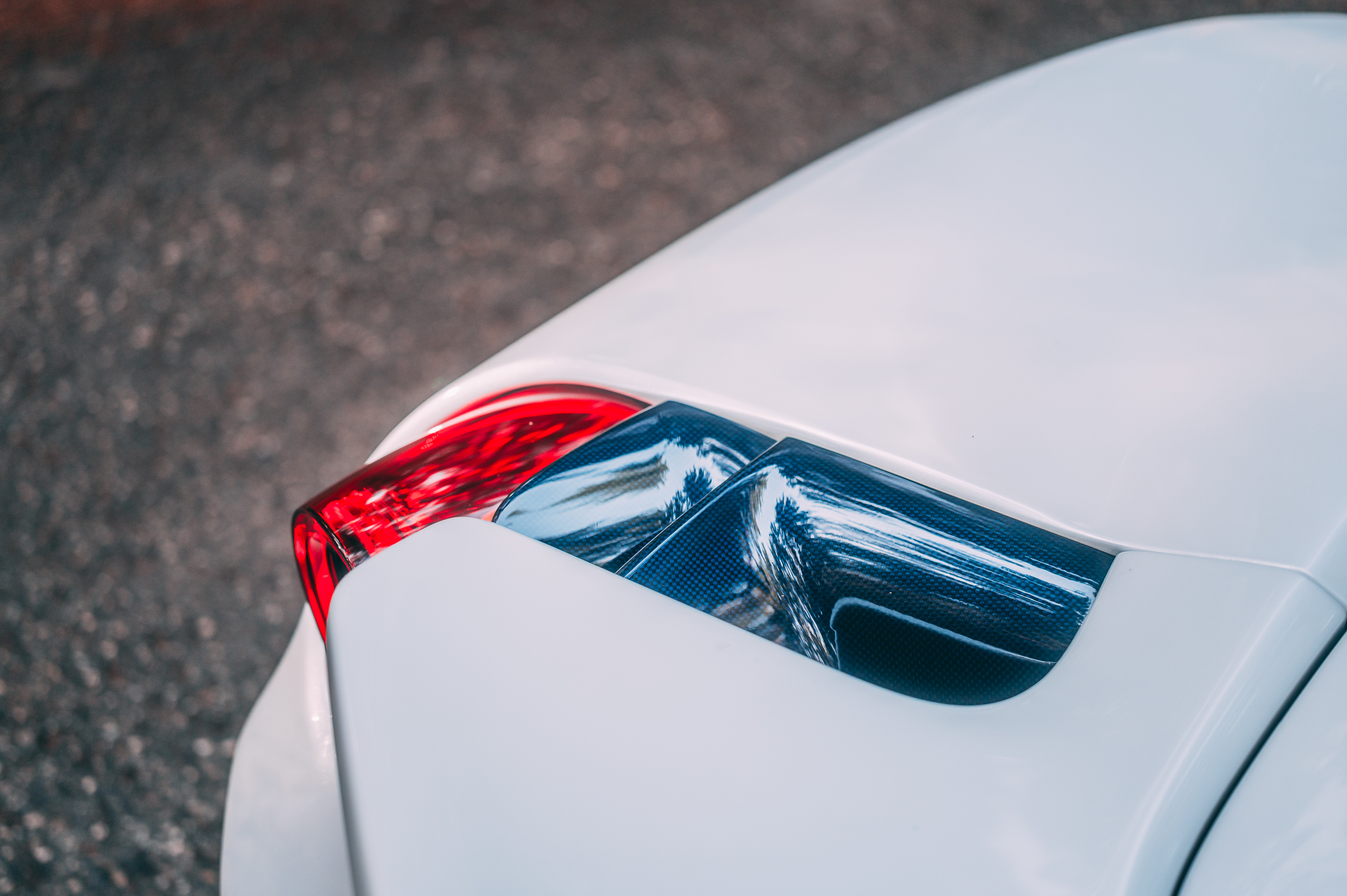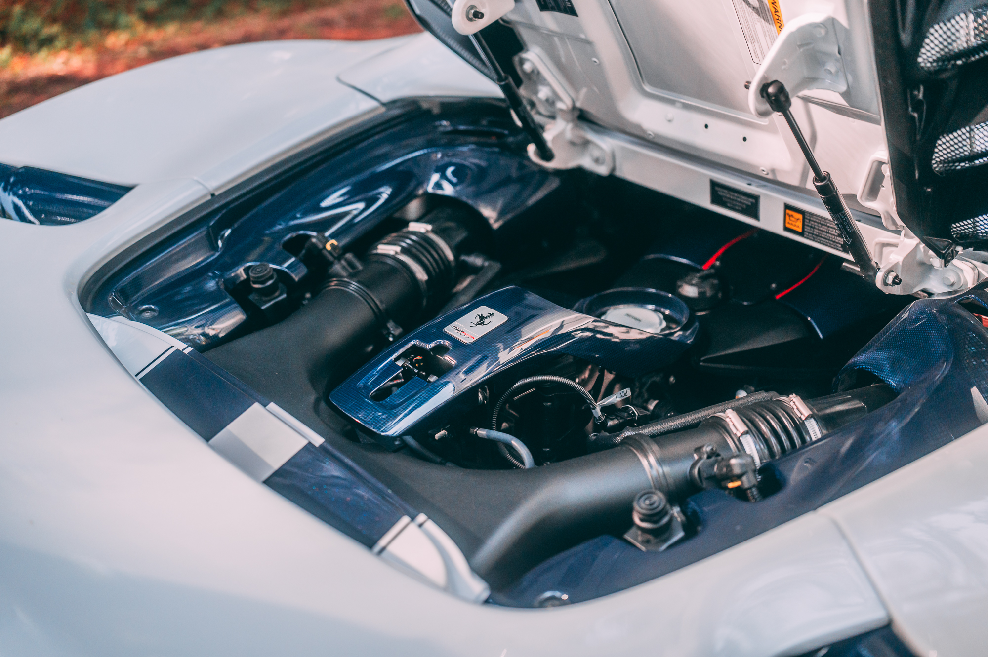 All possible carbon fibre options were ticked, in a stunning shade of Blu Lucido for the exterior with a gloss finish, complementing the Blue center stripe and the white paint. The level of detail is highly impressive with every element carefully contrasted in colour and finish forming a coherent design.