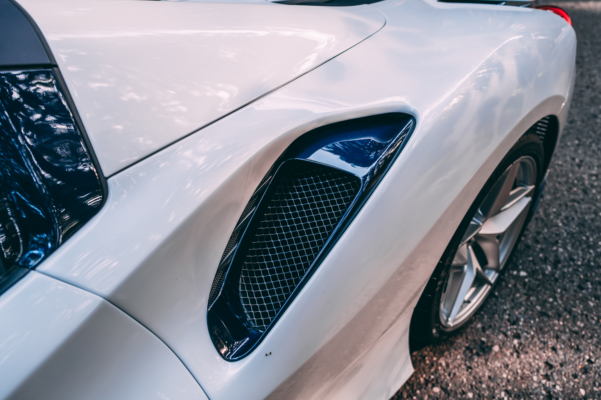 The most obvious cosmetic change also served an important engineering purpose. Air passes through the ducts in the front bumper which force it through a large vent in the bonnet, creating downforce over the nose. This combined with numerous underbody modifications and a revised rear diffuser produced 20% more downforce than a conventional 488 GTB.
