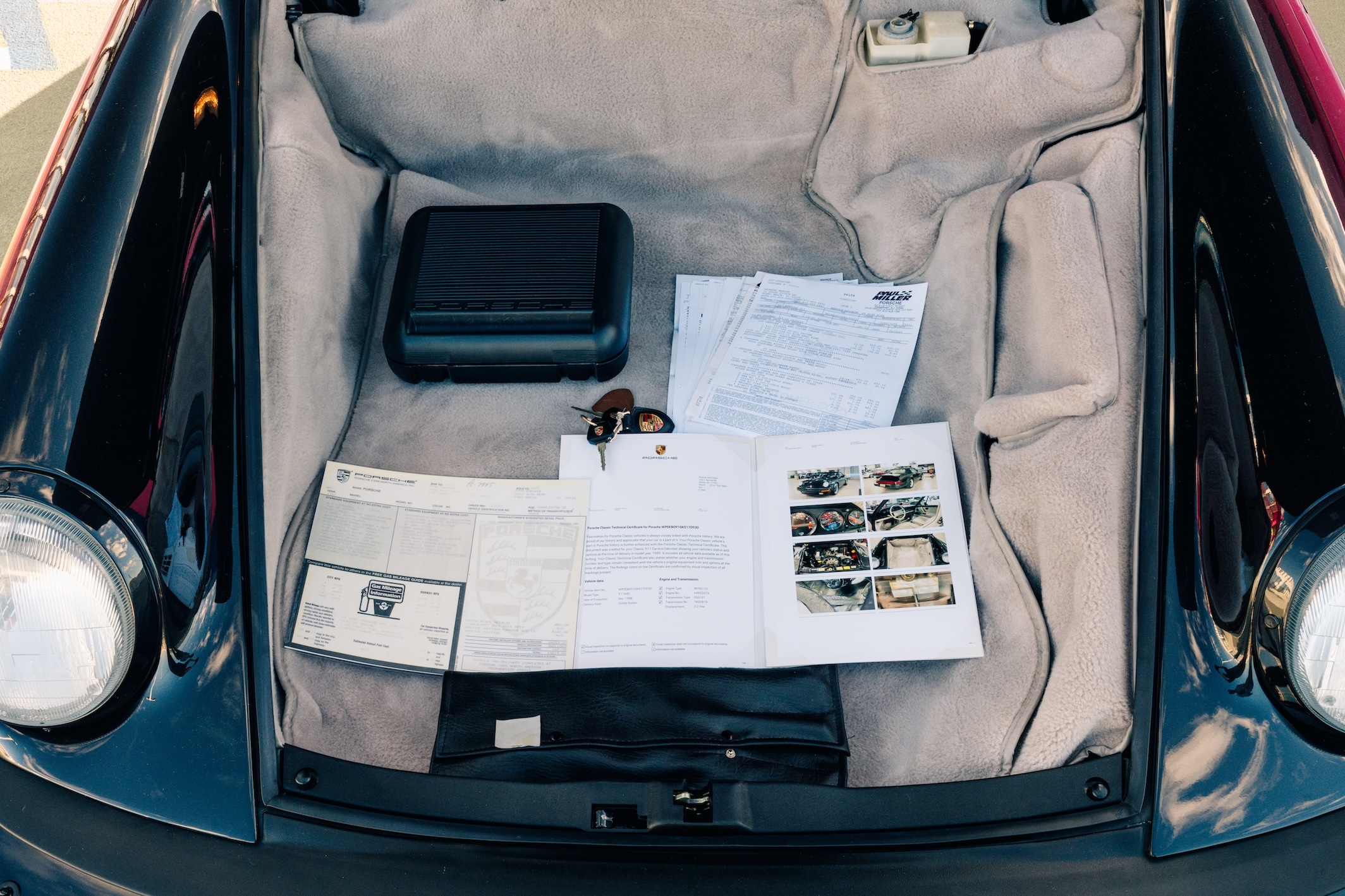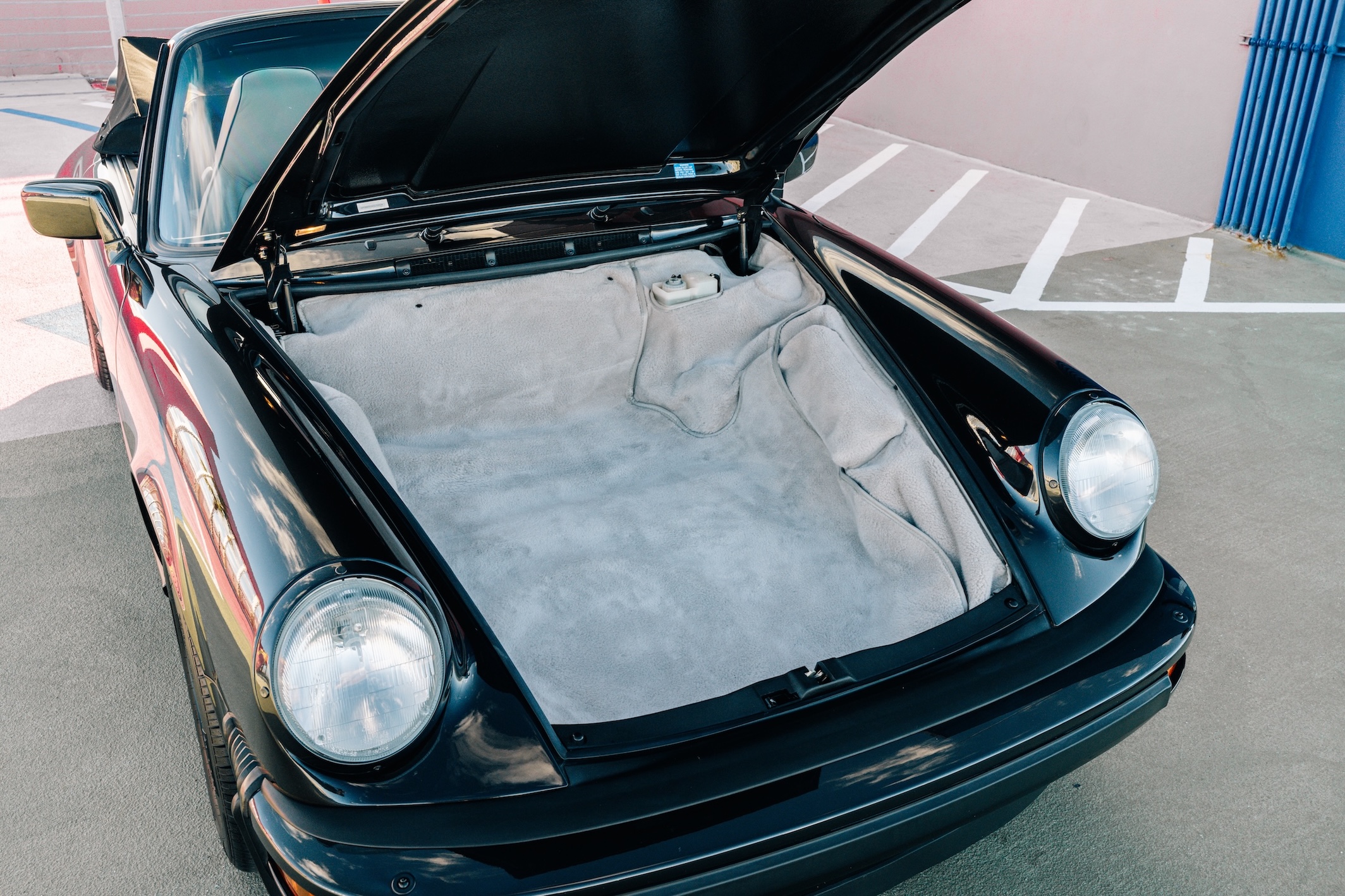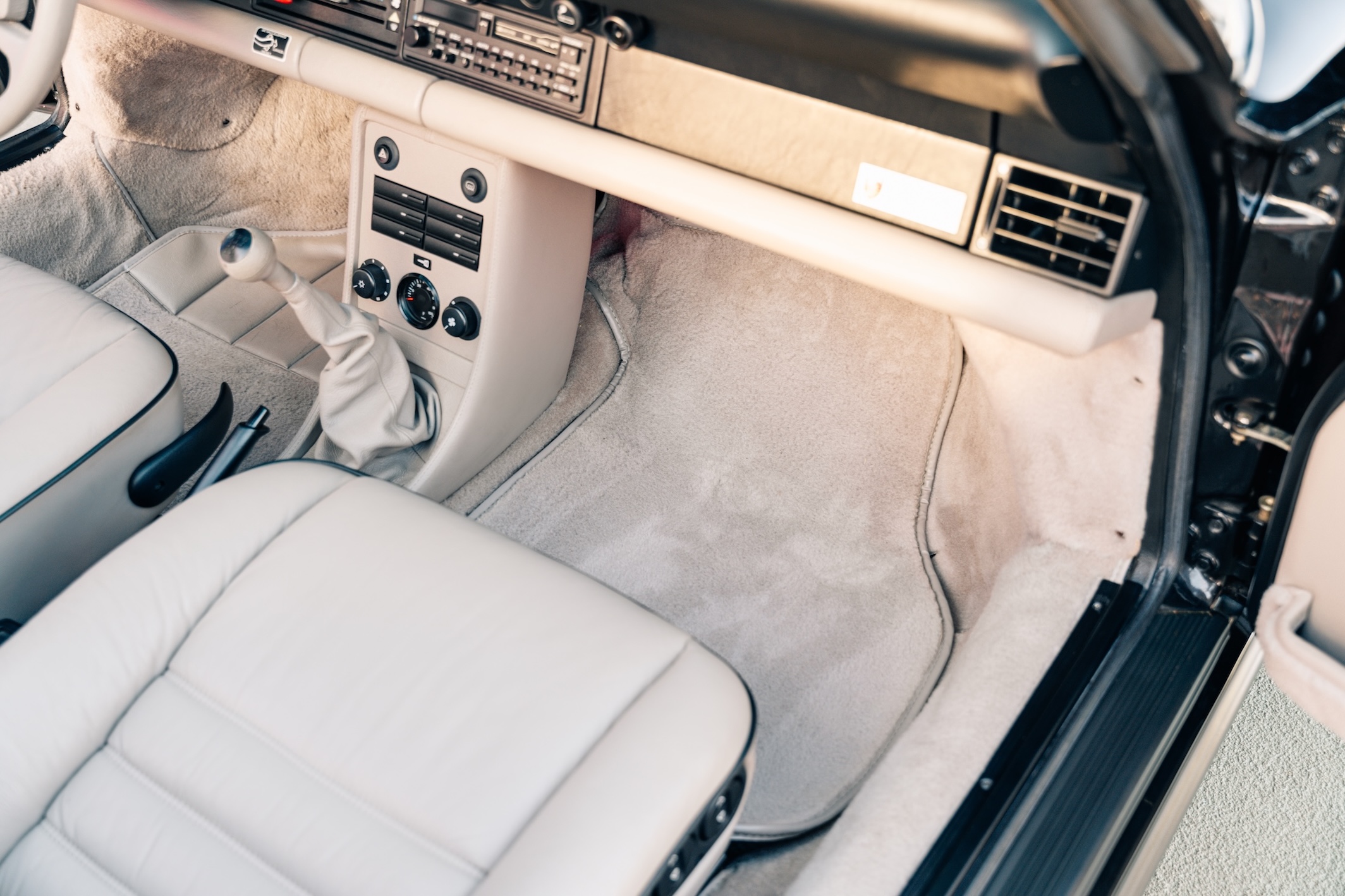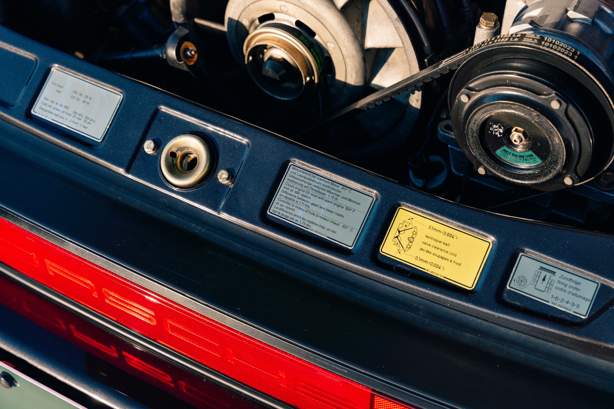 The interior showcases the quality and craftsmanship characteristic of late-1980s Porsche production. The Anniversary Edition featured commemorative badging and special interior detailing that distinguish it from standard Carreras. Leather surfaces remain supple, and the switchgear, instrumentation, and controls display minimal wear consistent with the car’s extremely low mileage. The cabin environment captures the analog purity of the era—clear gauges, simple ergonomics, and a driver-focused layout that connects you directly to the mechanical character of the car.