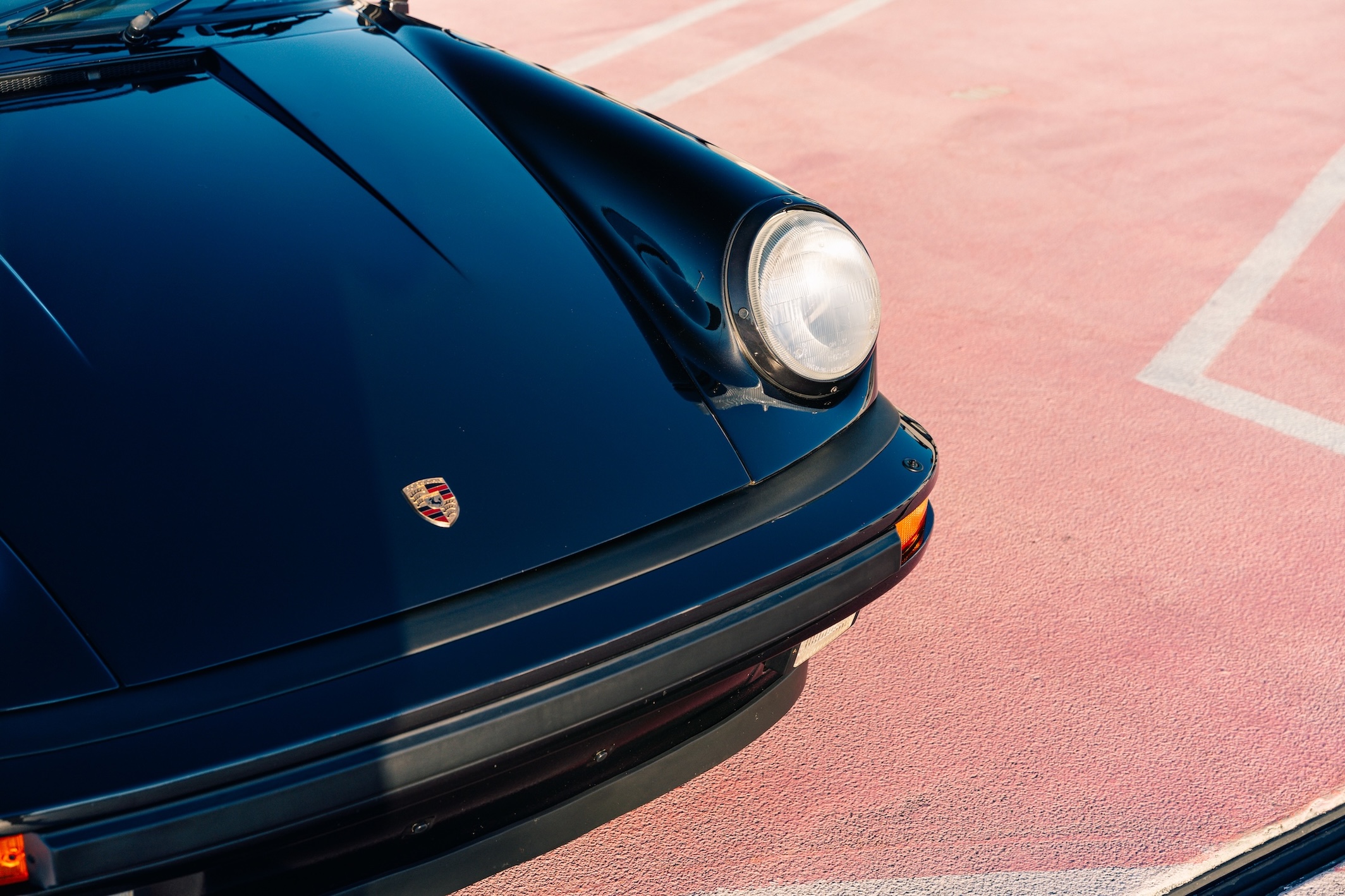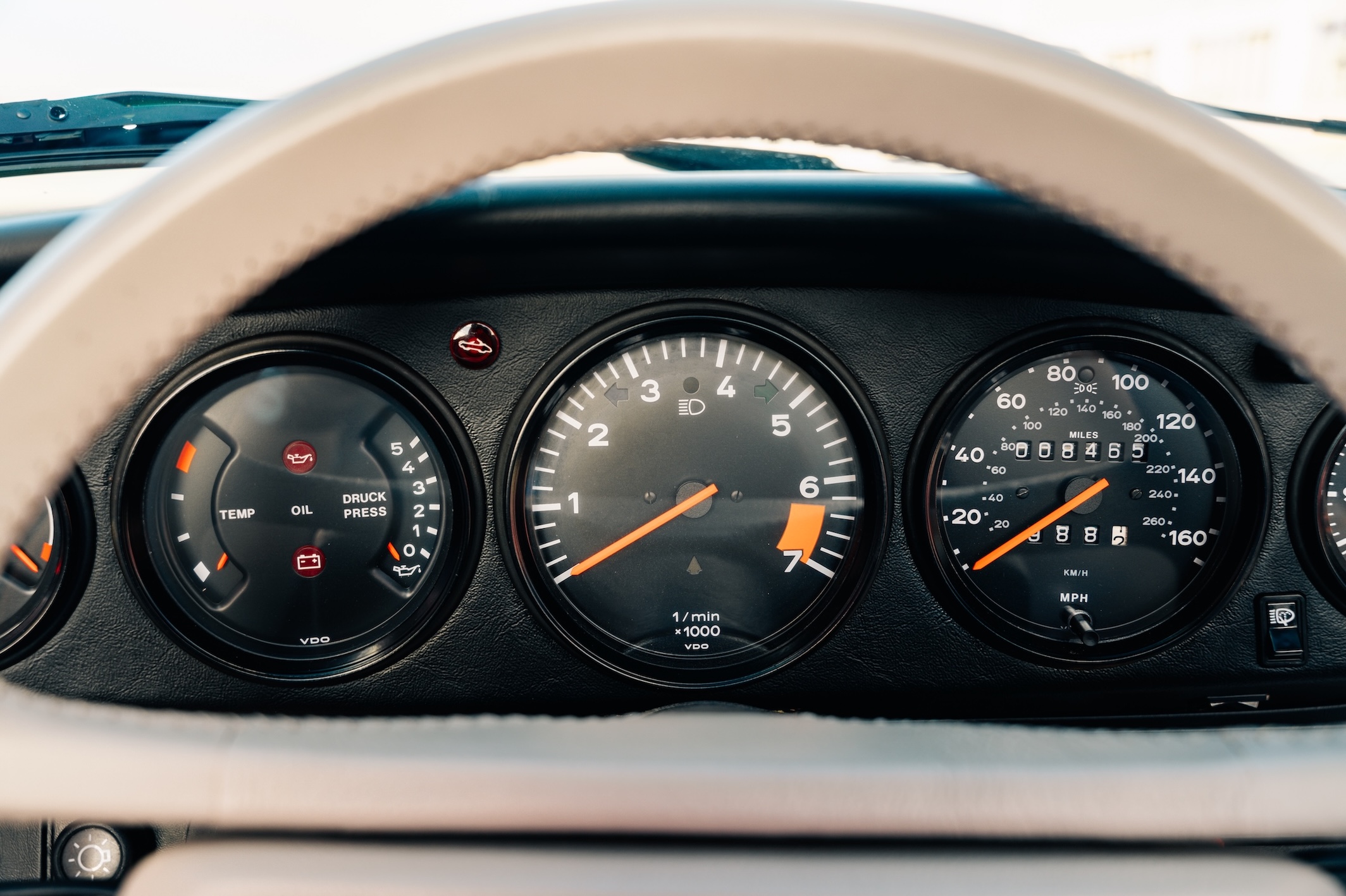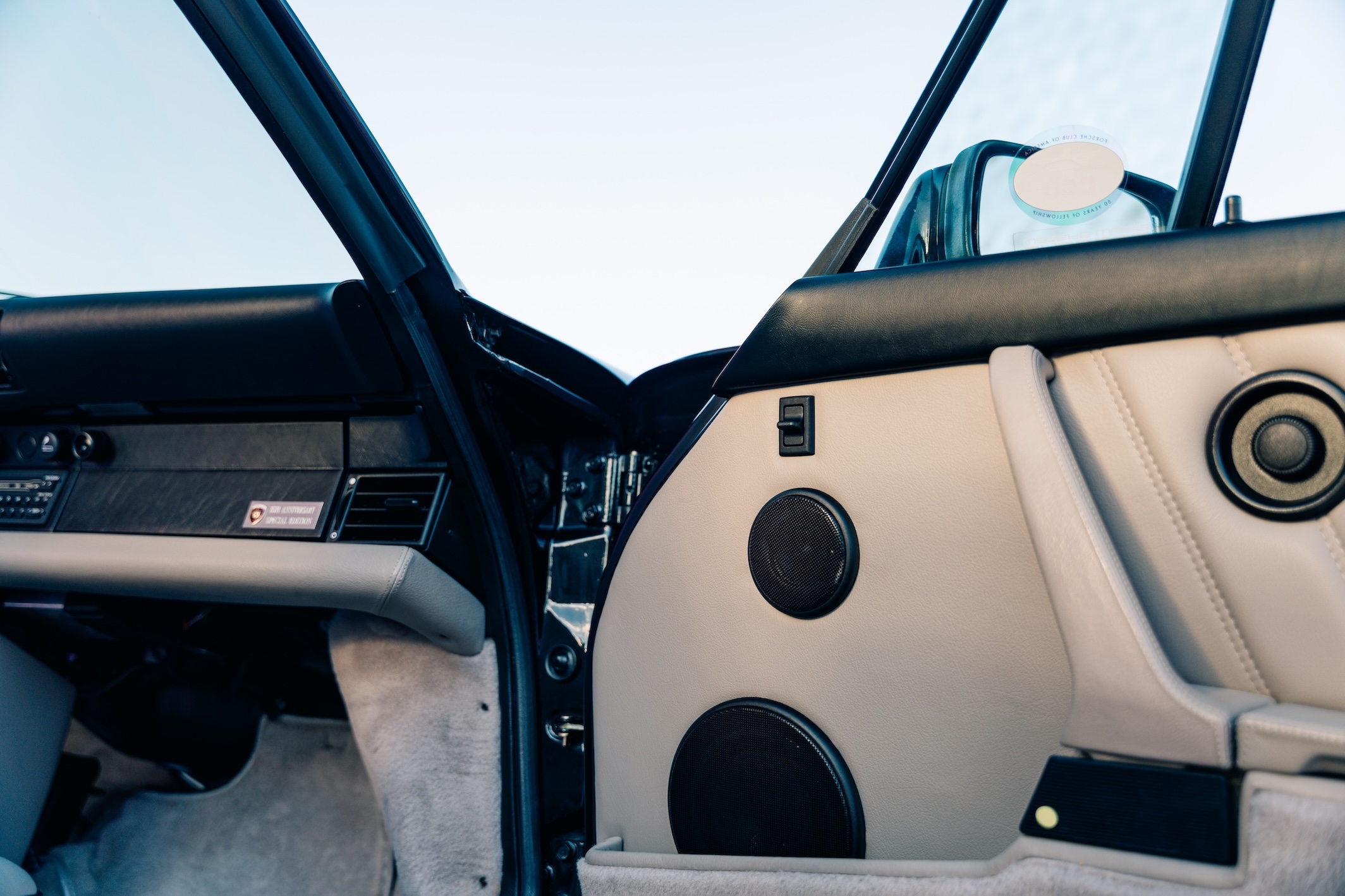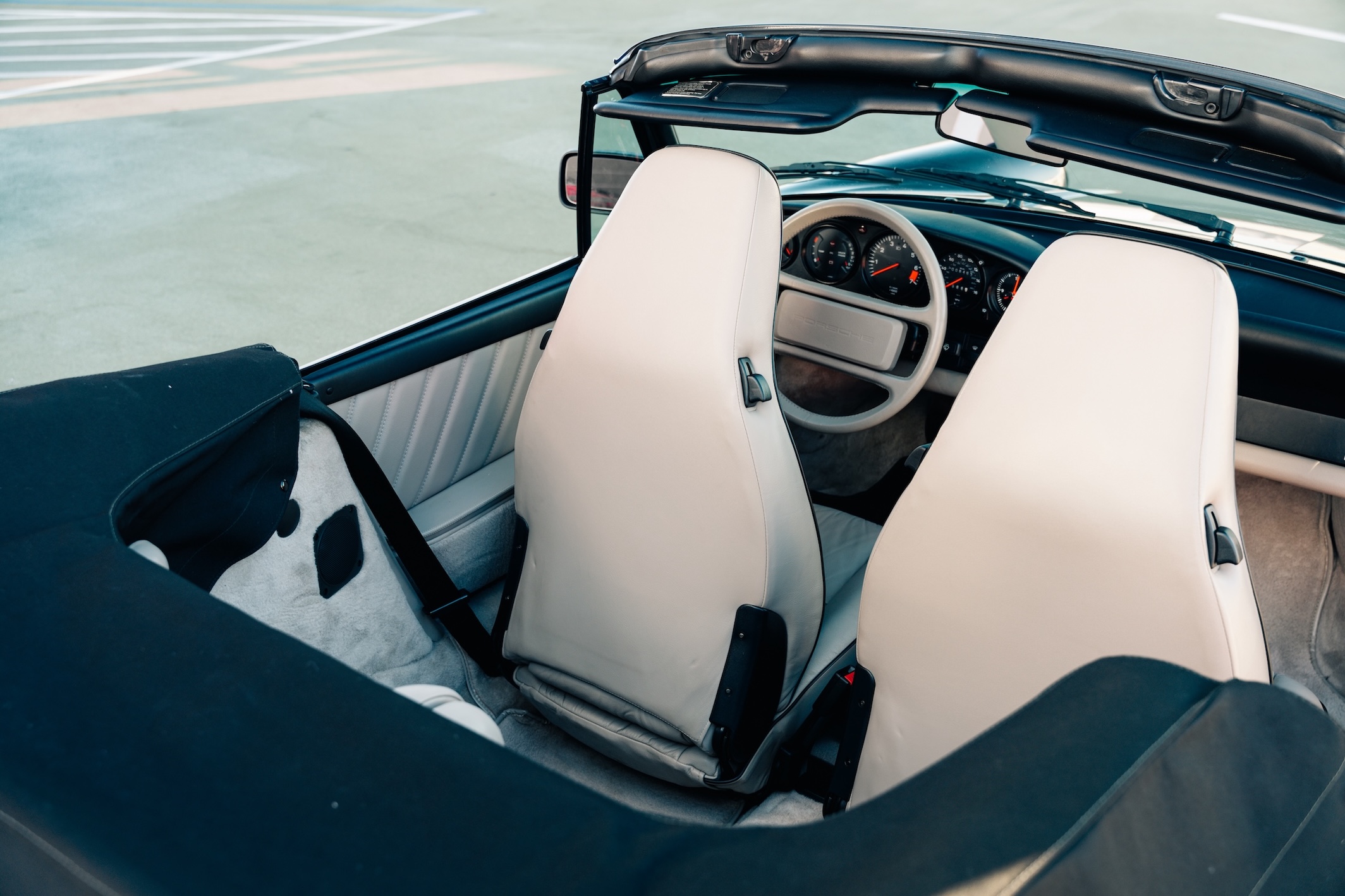 The interior showcases the quality and craftsmanship characteristic of late-1980s Porsche production. The Anniversary Edition featured commemorative badging and special interior detailing that distinguish it from standard Carreras. Leather surfaces remain supple, and the switchgear, instrumentation, and controls display minimal wear consistent with the car’s extremely low mileage. The cabin environment captures the analog purity of the era—clear gauges, simple ergonomics, and a driver-focused layout that connects you directly to the mechanical character of the car.