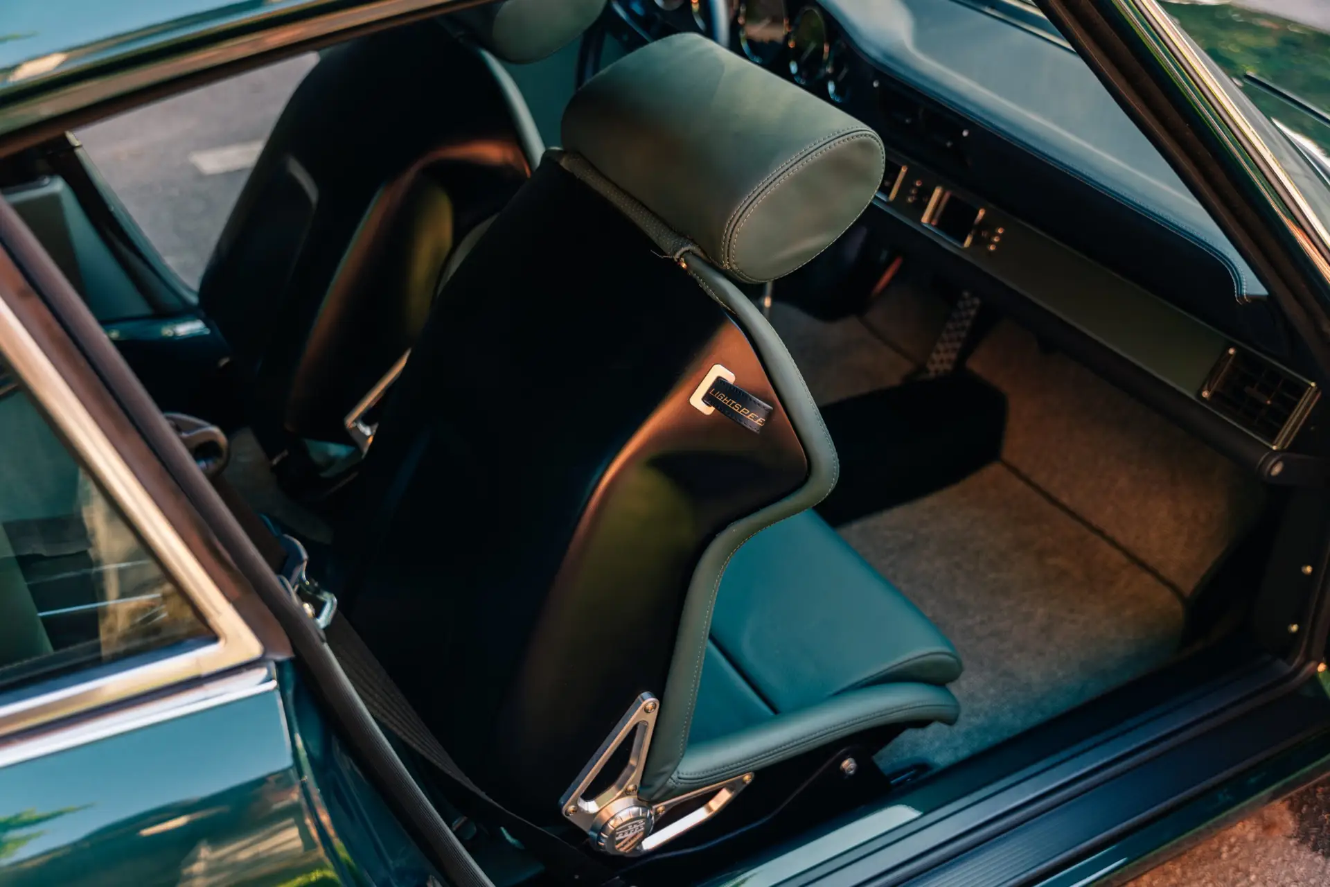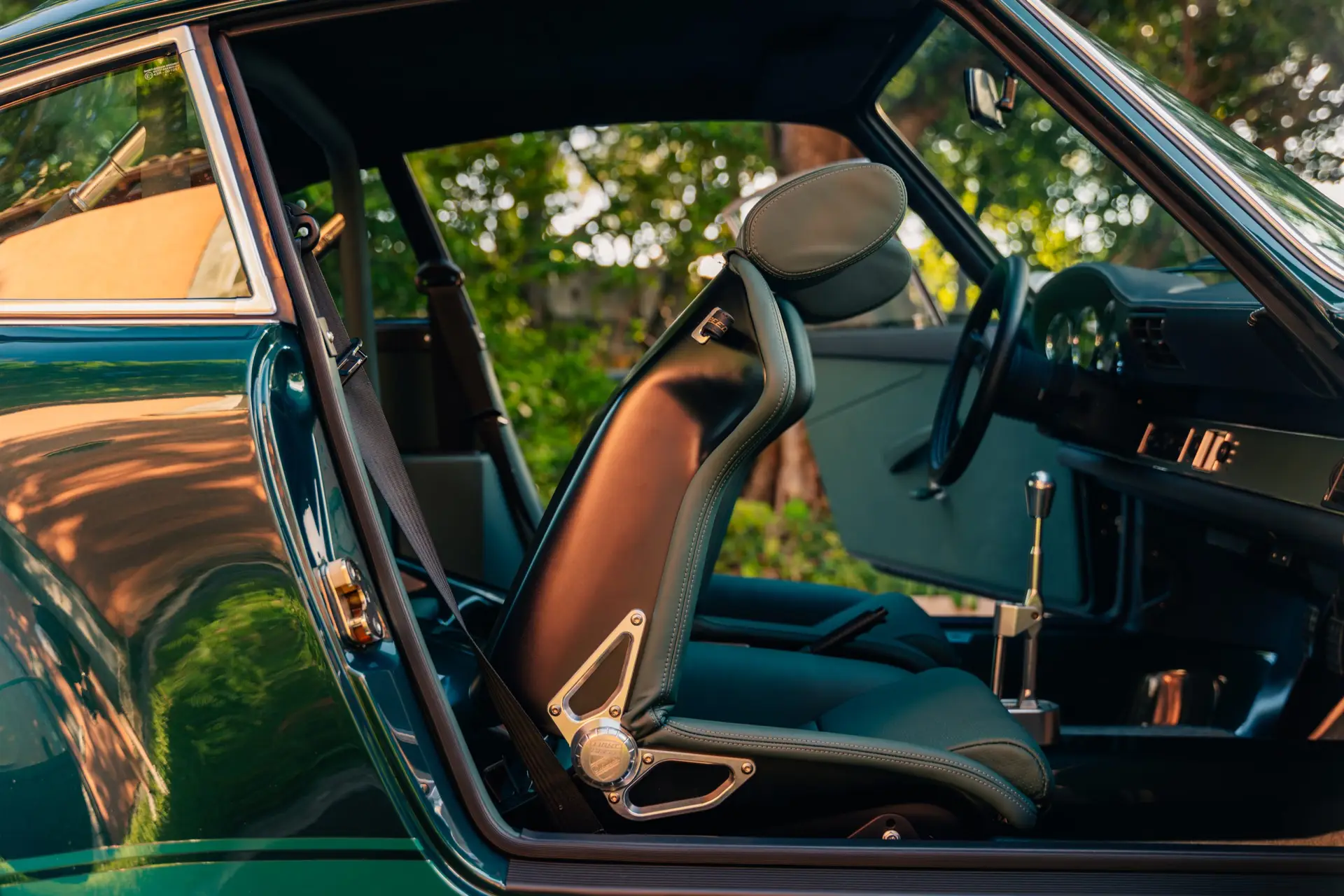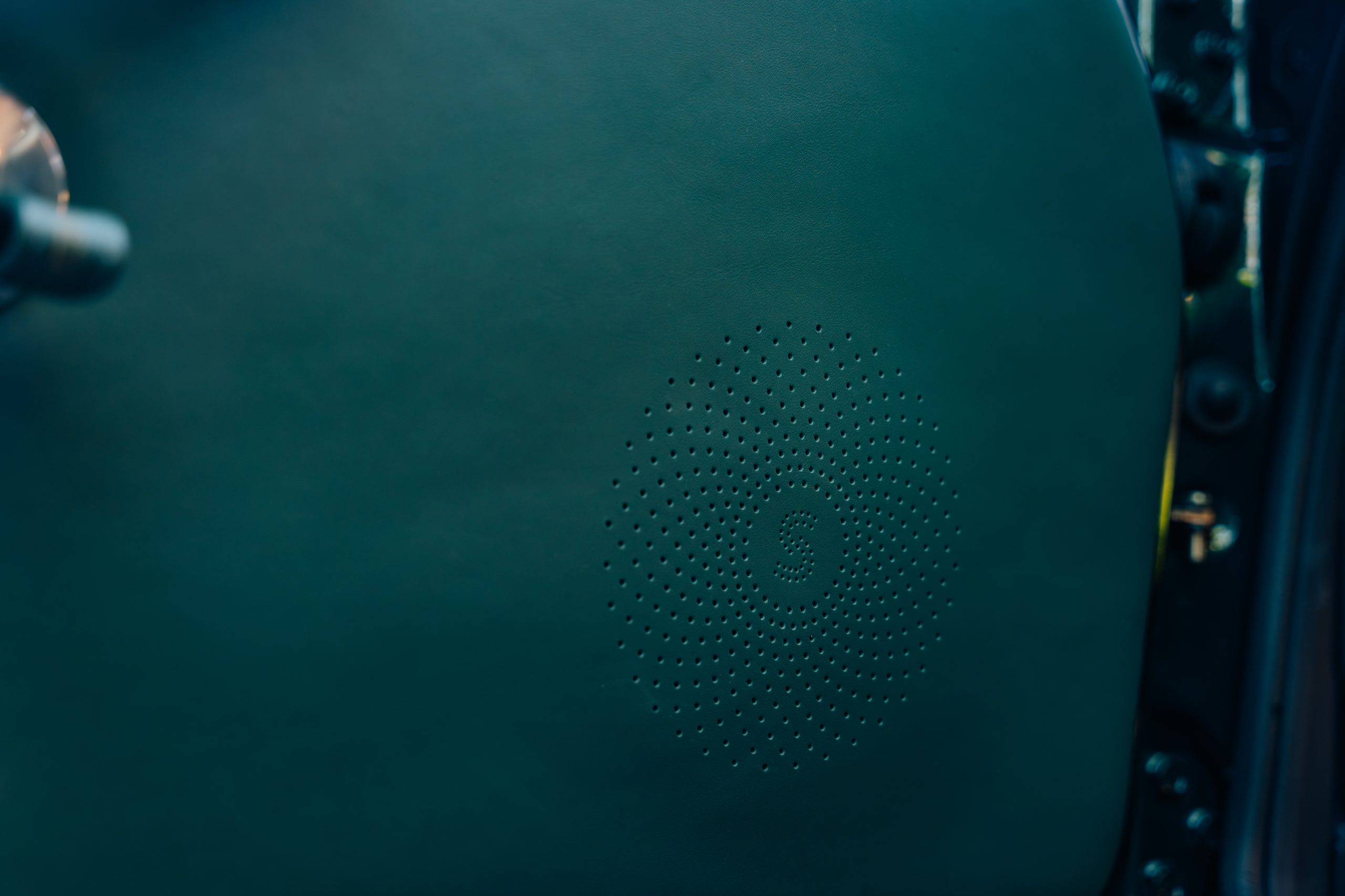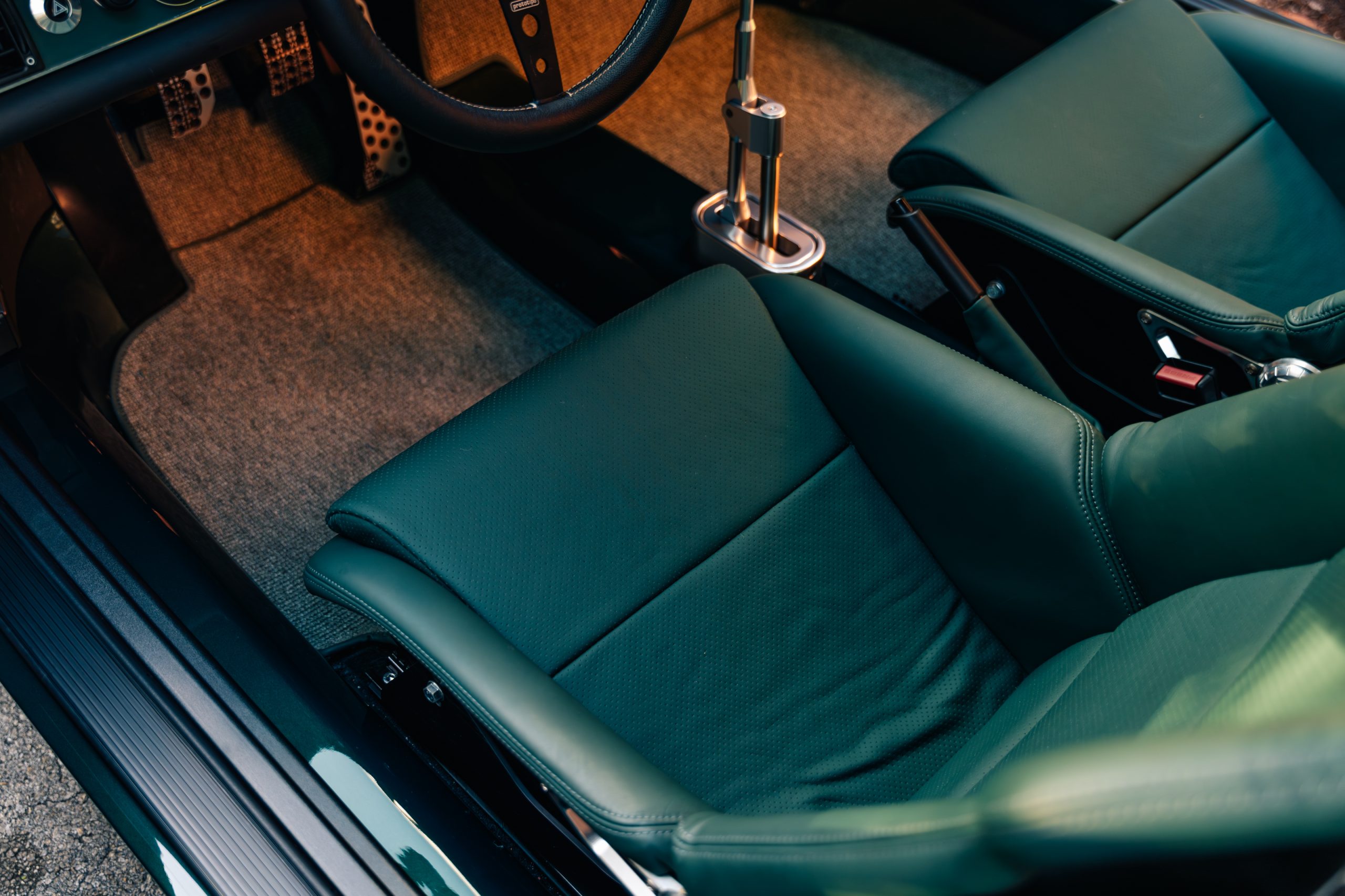 The exterior is finished in Porsche Racing Green Metallic, chosen to echo our company color and inspired by a client’s newly acquired 911 GT3. The interior continues this theme with green leather upholstery, complemented by a leather-wrapped roll cage and integrated speakers. Lightweight construction played an essential role: the rear lid, roof, and both front and rear fenders are made of carbon fiber, reducing weight without compromising strength. Inside, a precisely machined metal short shifter provides a direct and mechanical connection, making every gear change a tactile experience.