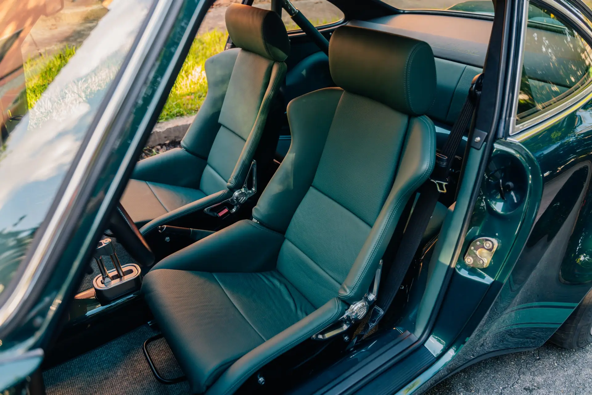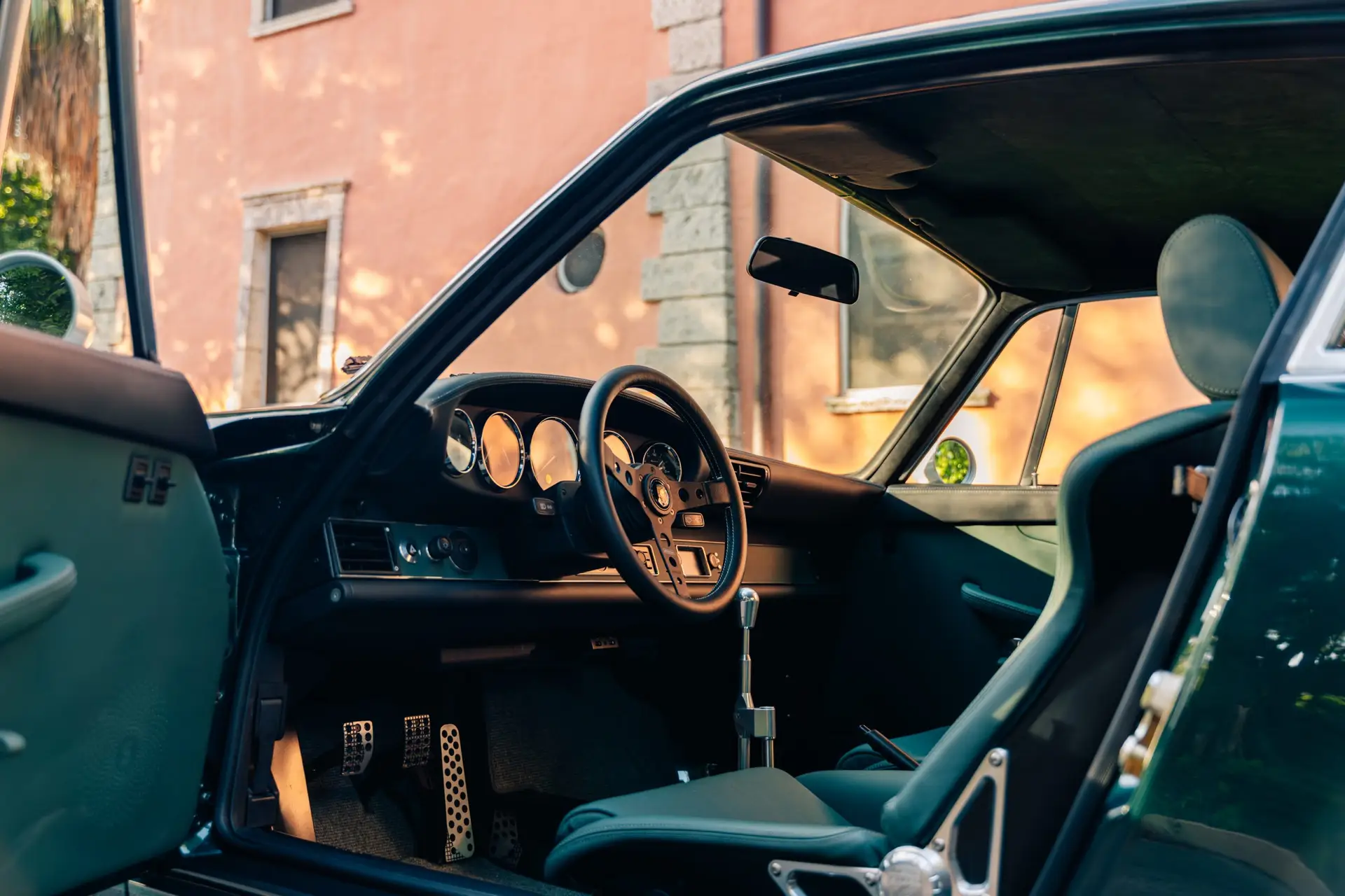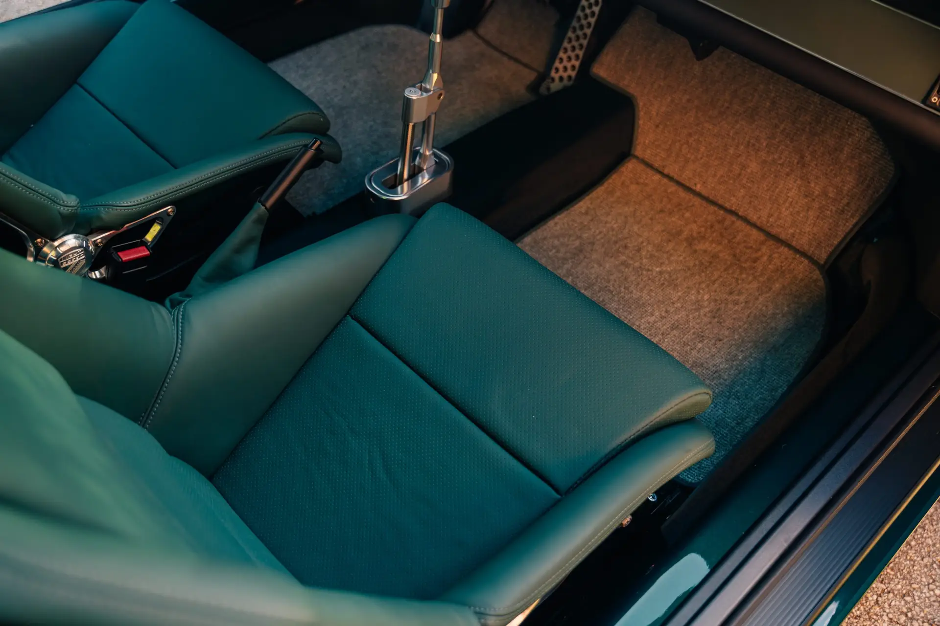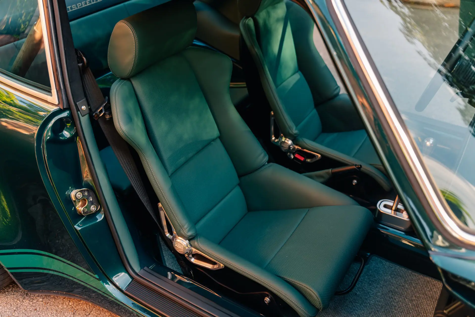 The exterior is finished in Porsche Racing Green Metallic, chosen to echo our company color and inspired by a client’s newly acquired 911 GT3. The interior continues this theme with green leather upholstery, complemented by a leather-wrapped roll cage and integrated speakers. Lightweight construction played an essential role: the rear lid, roof, and both front and rear fenders are made of carbon fiber, reducing weight without compromising strength. Inside, a precisely machined metal short shifter provides a direct and mechanical connection, making every gear change a tactile experience.