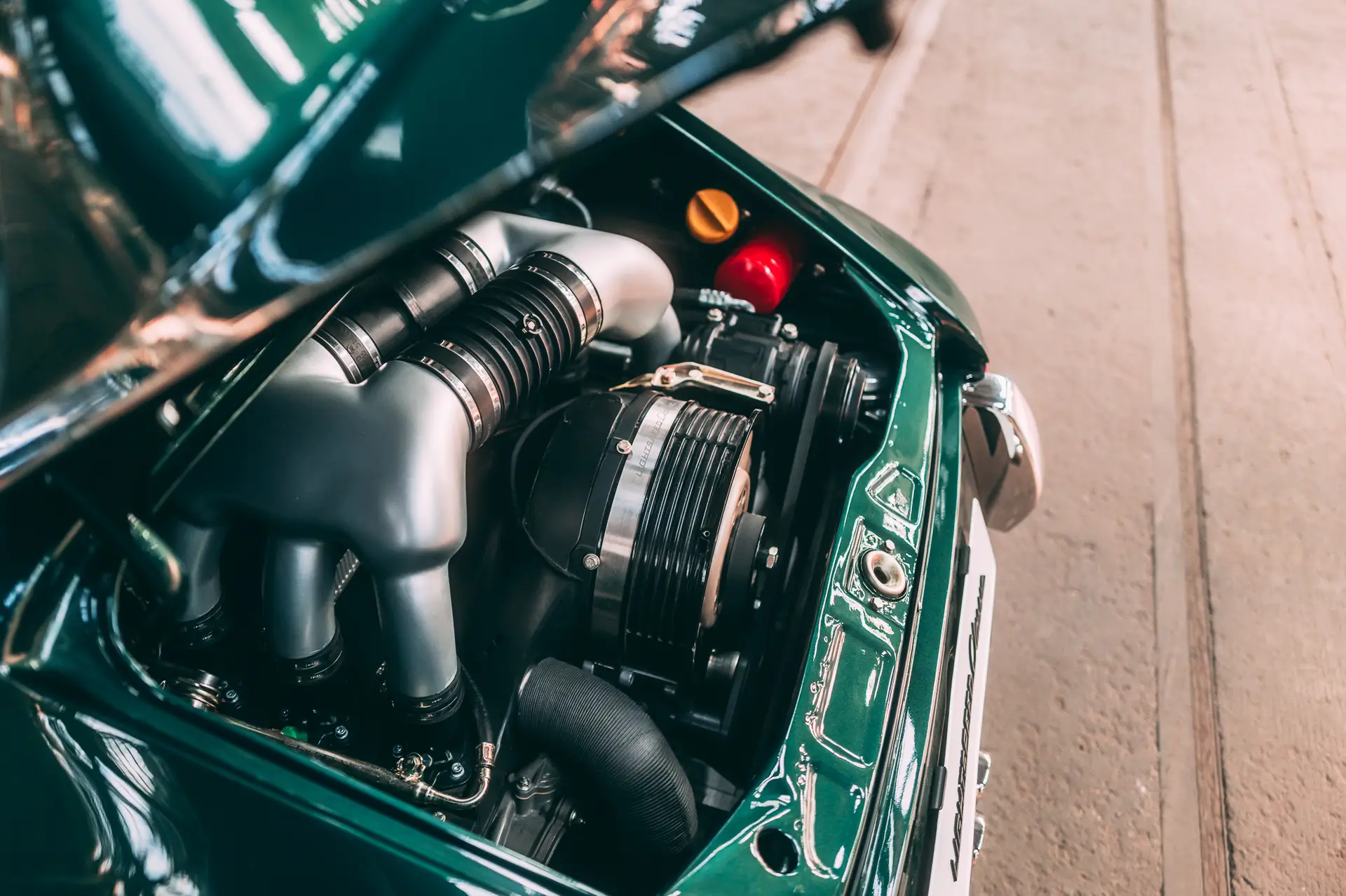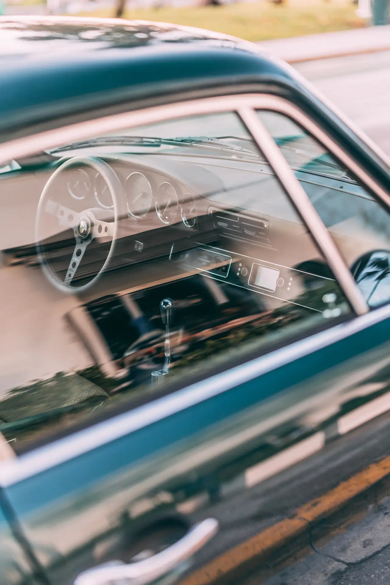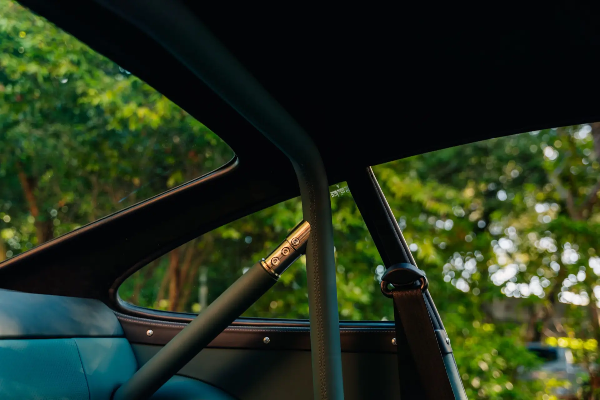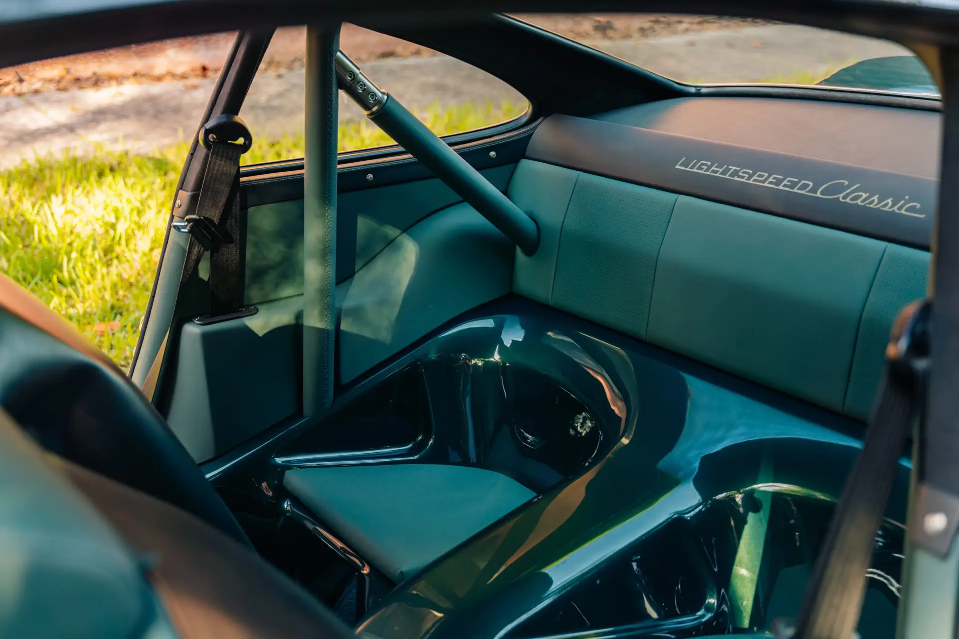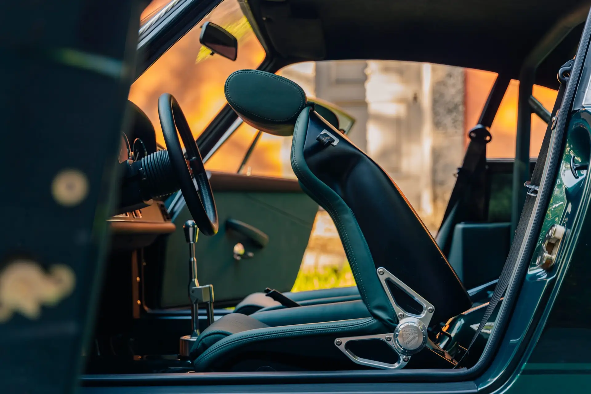 The exterior is finished in Porsche Racing Green Metallic, chosen to echo our company color and inspired by a client’s newly acquired 911 GT3. The interior continues this theme with green leather upholstery, complemented by a leather-wrapped roll cage and integrated speakers. Lightweight construction played an essential role: the rear lid, roof, and both front and rear fenders are made of carbon fiber, reducing weight without compromising strength. Inside, a precisely machined metal short shifter provides a direct and mechanical connection, making every gear change a tactile experience.