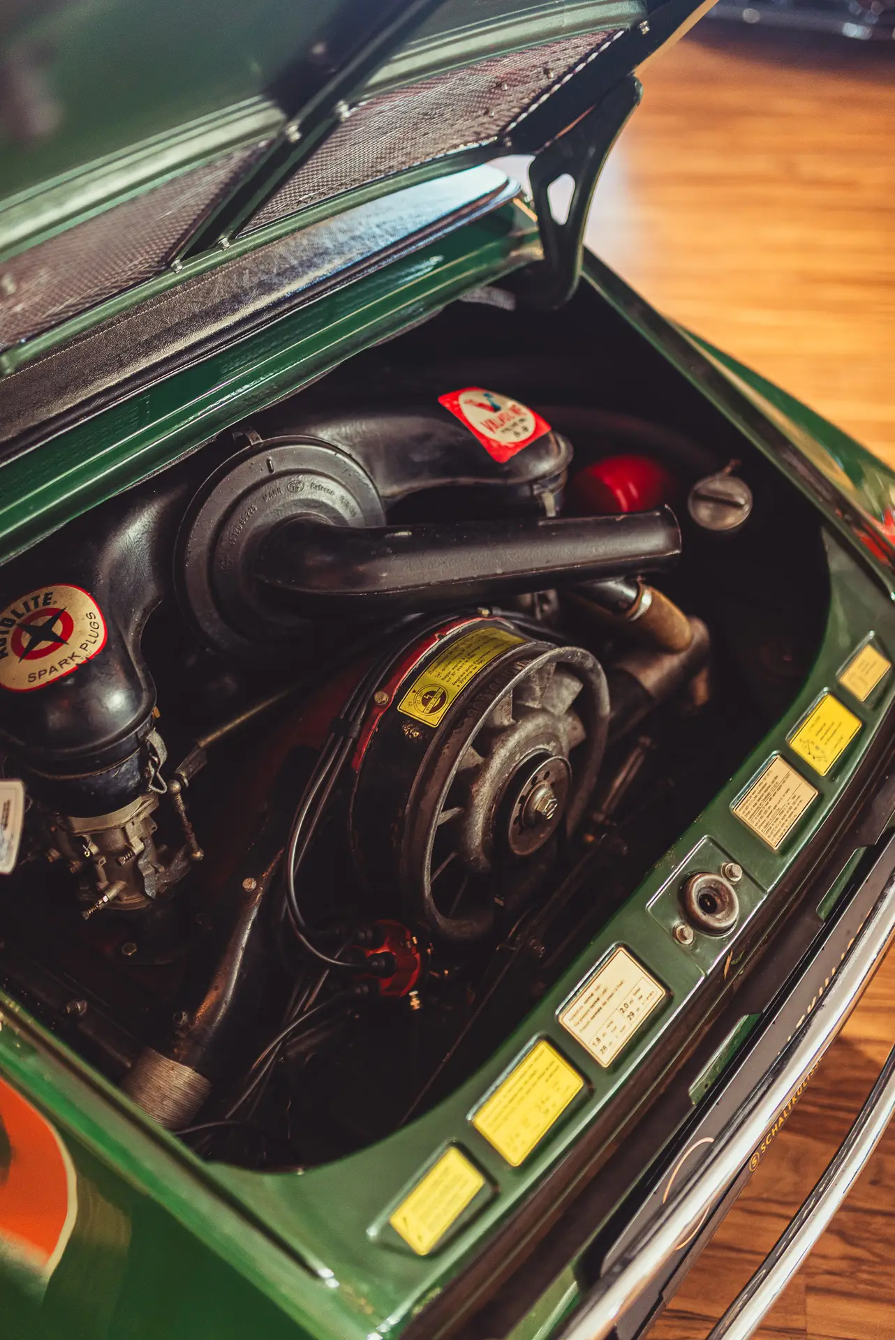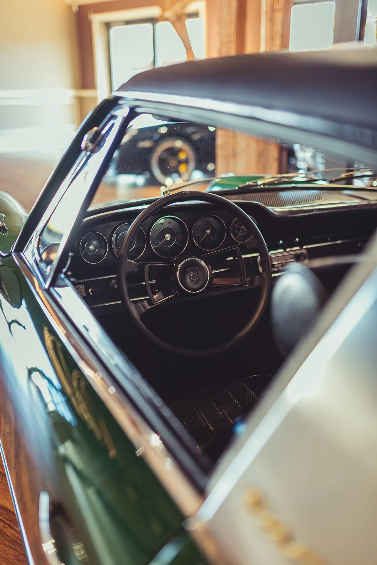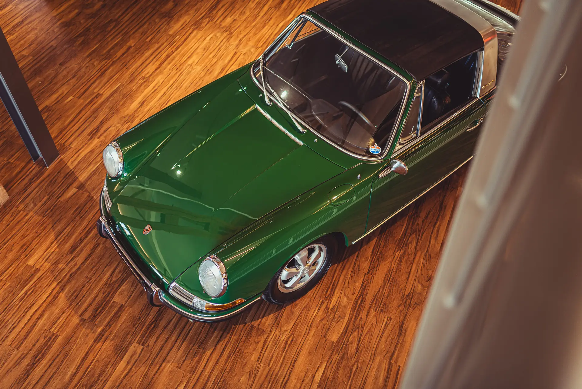 Our 911S Targa is a rare German delivery through dealer Raffay in Hamburg on the 26th of April 1967. The original color combination was Irish Green (irischgrün 6606 B) with a Black/Pepita interior (Kunstleder Schwarz/Pepita), as stated by the Porsche certificate accompanying the car.