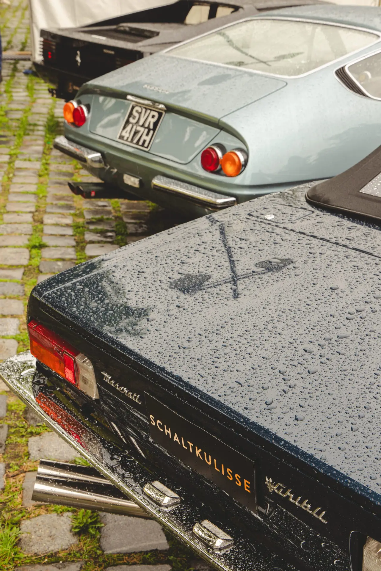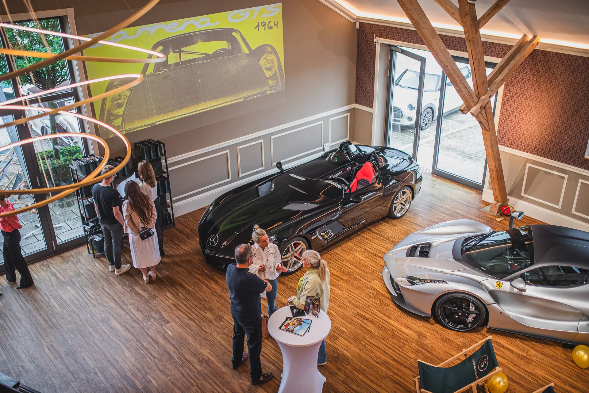 By Friday, the main event started at Gut Kaltenbrunn at the Tegernsee. Despite occasional rain, our team set up a compact showroom within our tent in the outdoor area, carefully designed to reflect the look and feel of our Munich showroom. Among the highlights on display were the Mercedes-Benz SLR McLaren Stirling Moss, a Maserati MC12, a red Ferrari 575 Superamerica, a black-on-black Testarossa, a Maserati Ghibli Spyder 4.7, a Ferrari 365 GTB/4 Daytona Plexi, and the Delahaye 175 S Coach from 1950. Many visitors explored the event grounds, showing great interest in the cars on display. Personally invited clients from the Schaltkulisse VIP circle were welcomed into our exclusive hospitality lounge, where they enjoyed high-quality catering by Feinkost Käfer.