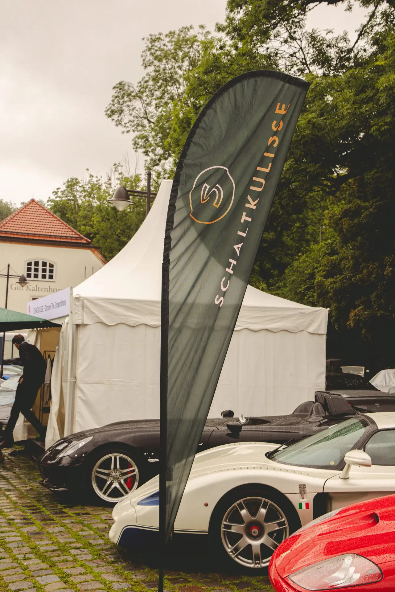 By Friday, the main event started at Gut Kaltenbrunn at the Tegernsee. Despite occasional rain, our team set up a compact showroom within our tent in the outdoor area, carefully designed to reflect the look and feel of our Munich showroom. Among the highlights on display were the Mercedes-Benz SLR McLaren Stirling Moss, a Maserati MC12, a red Ferrari 575 Superamerica, a black-on-black Testarossa, a Maserati Ghibli Spyder 4.7, a Ferrari 365 GTB/4 Daytona Plexi, and the Delahaye 175 S Coach from 1950. Many visitors explored the event grounds, showing great interest in the cars on display. Personally invited clients from the Schaltkulisse VIP circle were welcomed into our exclusive hospitality lounge, where they enjoyed high-quality catering by Feinkost Käfer.